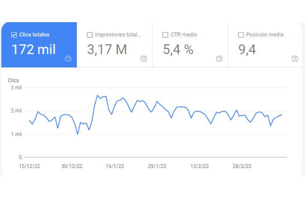 En esta imagen podemos ver un ejemplo de cómo se muestra la cantidad de clics totales a través de Search Console para un proyecto. Suele ir acompañado de las impresiones, el CTR y la posición media.