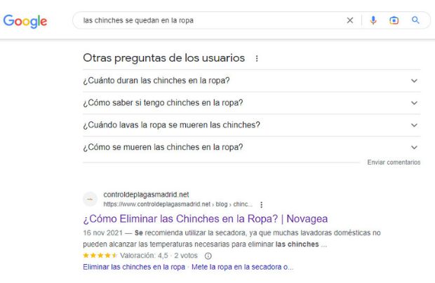 En este resultados podemos ver la búsqueda del conjunto de palabras clave “Las chinches se quedan en la ropa” dónde Novagea aparece en segunda posición.