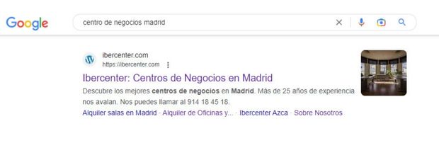 Como puedes comprobar en la imagen, si buscas la palabra clave “Centro de negocios en Madrid”, en la primera posición orgánica aparece Ibercenter, consiguiendo un alto número de clics.