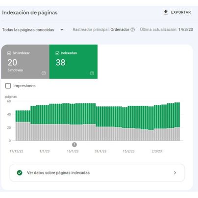 En esta imágen podemos ver el informe de cobertura con las páginas indexadas y sin indexar que nos muestra Search Console.