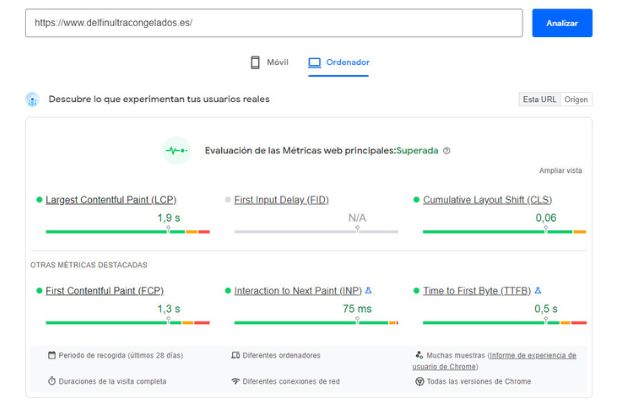 Para evaluar el KPI de velocidad de cargar podemos utilizar la página Page Speed Insights, donde hemos analizado la velocidad web de su página superando la prueba sin problemas.