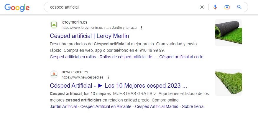 En Leroy Merlín han aplicado una estrategia SEO para pymes muy completa y han conseguido, por ejemplo, aparecer como primer resultado de búsqueda para la palabra clave “césped artificial” o la palabra clave long tail “comprar césped artificial por metro”.