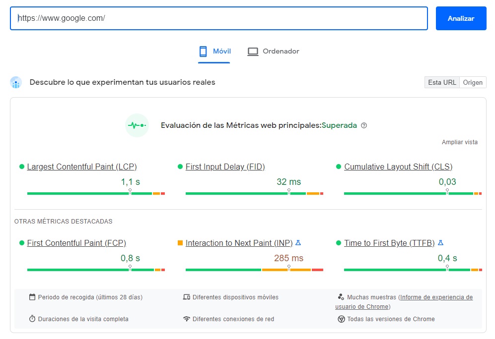 En la imagen a continuación hemos examinado la propia URL de Google.com para ver cómo son sus métricas usando la herramienta PageSpeed Insights.