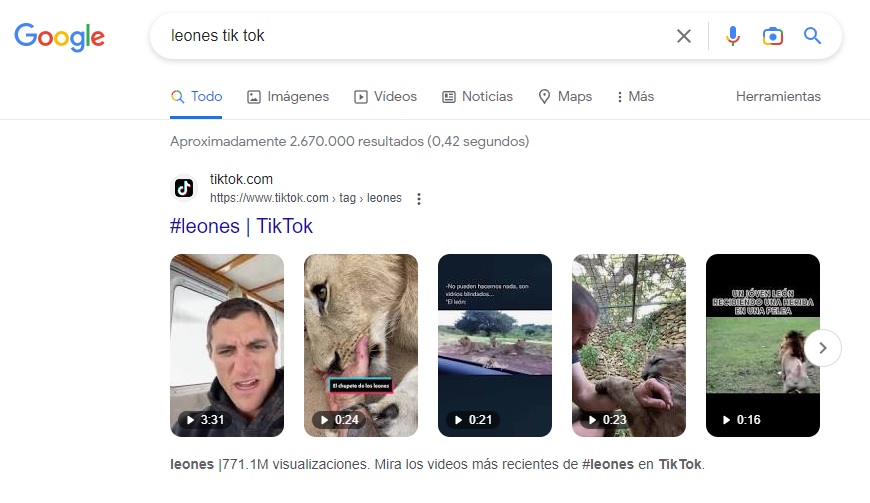 Pero no es el único, si hacemos una búsqueda acompañada del término tik tok como por ejemplo leones tik tok, veremos que los siguientes resultados serán una cadena de videos de la plataforma.