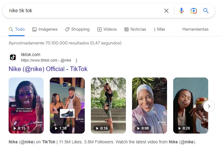 Aunque en un principio puede parecer complicado y es un término genérico, ¿Qué pasaría si lo que buscamos es una marca conocida? Como podemos comprobar con la foto aparecería el Tik Tok oficial de la marca.
