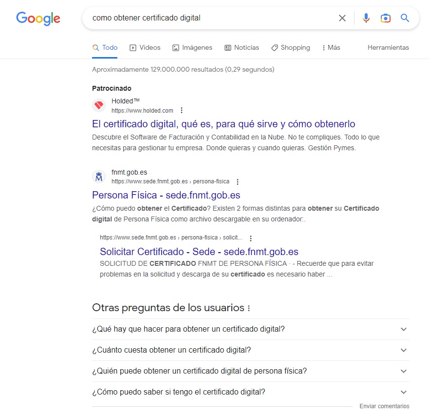 Por ejemplo, si buscas cómo obtener un certificado digital, algunas de las sugerencias que te ofrece son cuánto cuesta o quién puede obtenerlo, consultas muy relacionadas con tu búsqueda y que tienen un alto porcentaje de acabar leyendo.